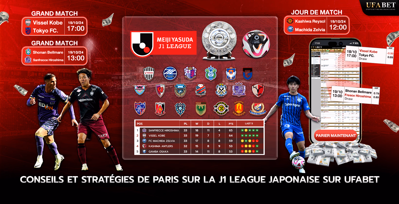 Le haut niveau de compétition et la présence de joueurs vedettes dans la J1 League contribuent à une atmosphère palpitante qui enrichit l'expérience de pari. Les options de pari complètes d’Ufabet permettent aux utilisateurs de parier sur divers marchés, allant des résultats des matchs aux performances individuelles, exploitant ainsi leur connaissance de la ligue.